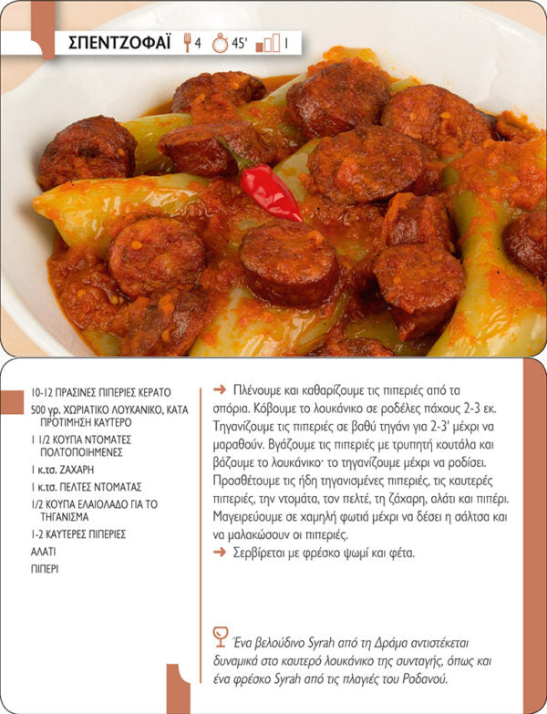 Οι συνοπτικές οινικές προτάσεις του ειδικευμένου οινολόγου Δρ Δημήτρη Χατζηνικολάου βασίζονται στη χρωματική, αρωματική και γευστική ισορροπία του δίδυμου κρασιού-φαγητού και συμβάλλουν στη δημιουργία ενός ευχάριστου αλληλοσυμπληρούμενου συνόλου. Οι προτεινόμενες ελληνικές ποικιλίες συμπληρώνονται εναλλακτικά από προτάσεις αντίστοιχων διεθνών.