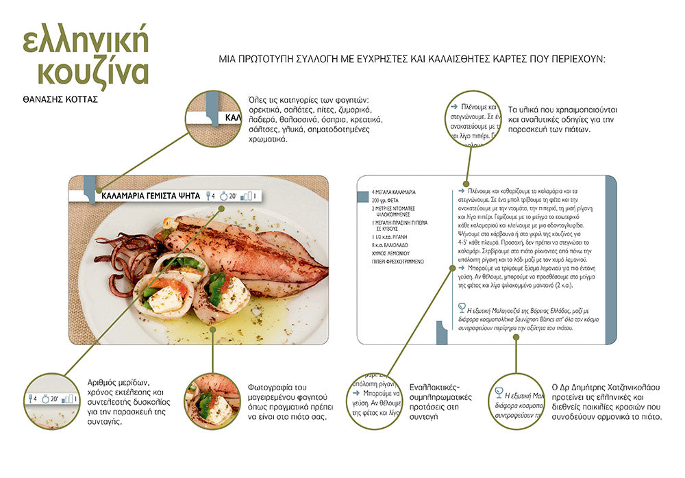 Οι συνταγές που παρουσιάζονται στις κάρτες ανήκουν στην ελληνική παραδοσιακή κουζίνα, η οποία βασίζεται σε μία από τις αρχαιότερες γαστριμαργικές παραδόσεις στον κόσμο. Η ελληνική μαγειρική ως παραδοσιακή και μεσογειακή χαρακτηρίζεται από τη χρήση εξαιρετικών φρέσκων εποχιακών υλικών, όπως τα λαχανικά, τα χόρτα, και τα ψάρια· περιλαμβάνει κρέας και ζυμαρικά, όσπρια, ρύζι και πατάτες, χρησιμοποιεί βότανα και μυρωδικά και κυρίως ελαιόλαδο.
