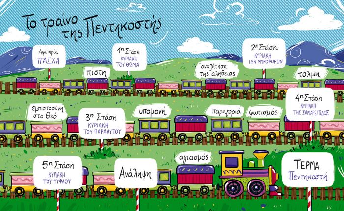 Η γιορτινή παρέα µε ύµνους και τραγούδια πανηγυρίζει και διαλαλεί το χαρµόσυνο µήνυµα της Ανάστασης, συντροφιά µε τους αγίους και τις αγίες της άνοιξης µέχρι και την… Πεντηκοστή!