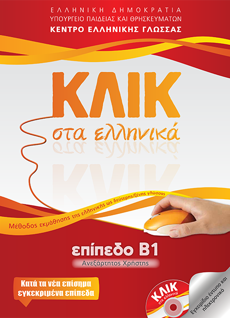 ΚΛΙΚ στα ελληνικά. Επίπεδο Β1 - Ανεξάρτητος χρήστης. Μέθοδος εκμάθησης της ελληνικής ως δεύτερης/ξένης γλώσσας. Βασίζεται στο Νέο Αναλυτικό Εξεταστικό Πρόγραμμα, εφαρμόζει τις αρχές της σύγχρονης διδακτικής και καλλιεργεί όλες τις δεξιότητες. Προετοιμάζει ευχάριστα και αποτελεσματικά τους υποψήφιους των εξετάσεων για την Πιστοποίηση Επάρκειας της Ελληνομάθειας στο επίπεδο Β1 θέτοντας στέρεες βάσεις για τα επόμενα επίπεδα. Καινοτομεί παρέχοντας στους χρήστες πρόσβαση στο ηλεκτρονικό «Κλικ στα ελληνικά».
