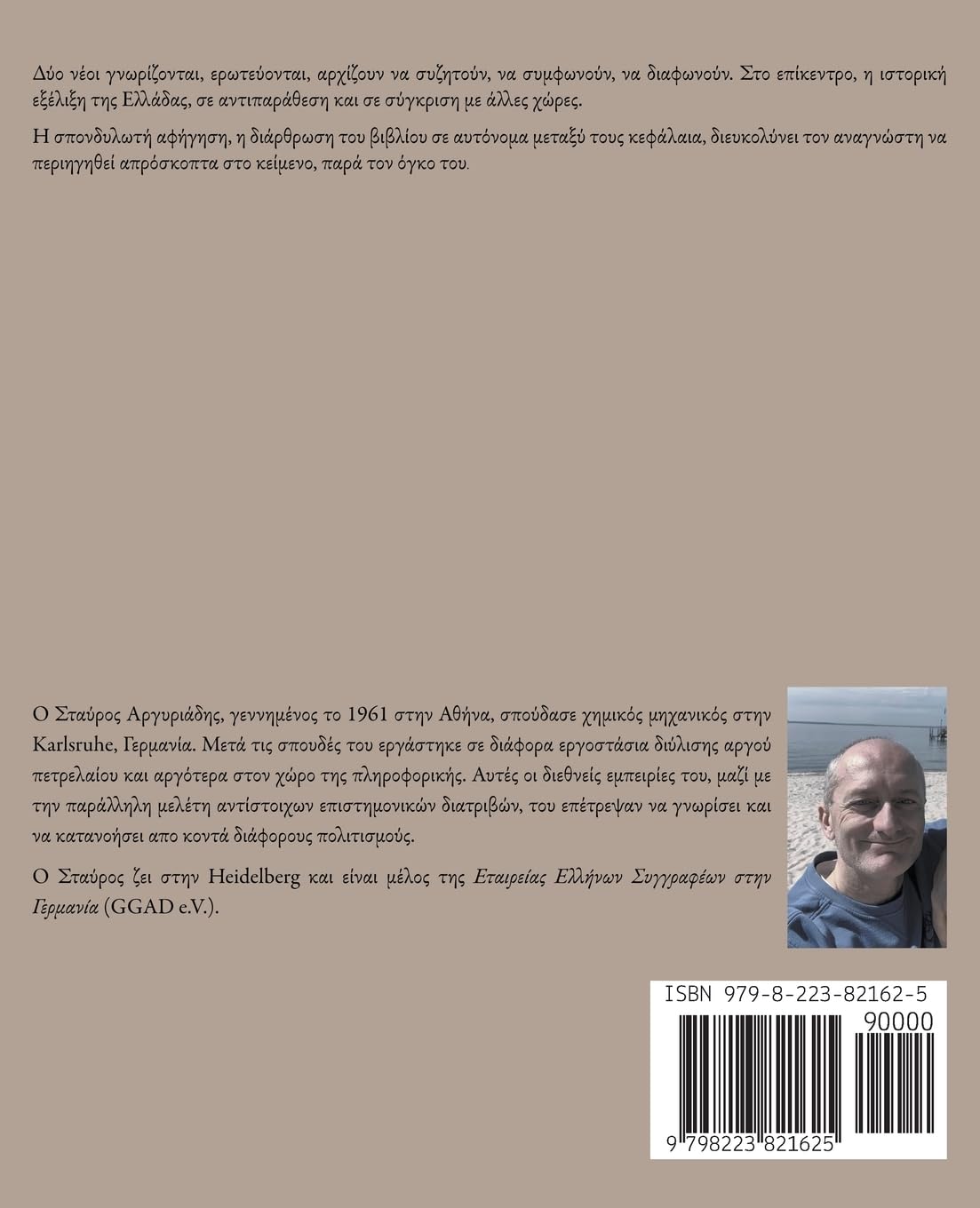 Δύο νέοι γνωρίζονται, ερωτεύονται, αρχίζουν να συζητούν, να συμφωνούν, να διαφωνούν. Στο επίκεντρο, η ιστορική εξέλιξη της Ελλάδας και τα κακώς κείμενα της χώρας, μιας χώρας εν κρίσει, σε αντιπαράθεση και σε σύγκριση με άλλες χώρες, οι οποίες τα καταφέρνουν πολύ καλύτερα. Μέσω της μυθιστορηματικής αφήγησης, αλλά και των ιστορικά και επιστημονικά τεκμηριωμένων πολιτικο-φιλοσοφικών διαλόγων, αναλύονται τα αίτια και οι λόγοι που δυσκολεύουν εδώ και 200 χρόνια τη χώρα να ορθοποδήσει ως μια σύγχρονη, κοσμικού τύπου ευρωπαϊκή δημοκρατία. Πεποίθηση του συγγραφέα είναι ότι η Ελλάδα θα μπορούσε εκ νέου να προαγάγει, με πρωτοπόρο, νεοπαγή και καινοφανή τρόπο την ευημερία, την τεχνολογία και τις επιστήμες. Όπως έπραξε, άλλωστε, με μεγάλη επιτυχία και κατά την Κλασική περίοδο στην ίδια ακριβώς γεωγραφική περιοχή.